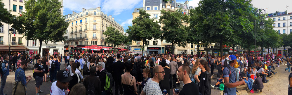 J'arrive à 18h30 au lieu du rassemblement, Fontaine des Innocents. J'aime la symbolique du nom. Une petite centaine de personnes est déjà là, je reconnais de loin le drapeau noir et rose d'Act-Up. Je repense à ma première Marche où nous étions au final à peine 5000, nous avions attendu un bon moment d'être un millier pour pouvoir partir. A cette époque le militantisme était fort et très présent, il y avait tout (ou presque) à faire encore...